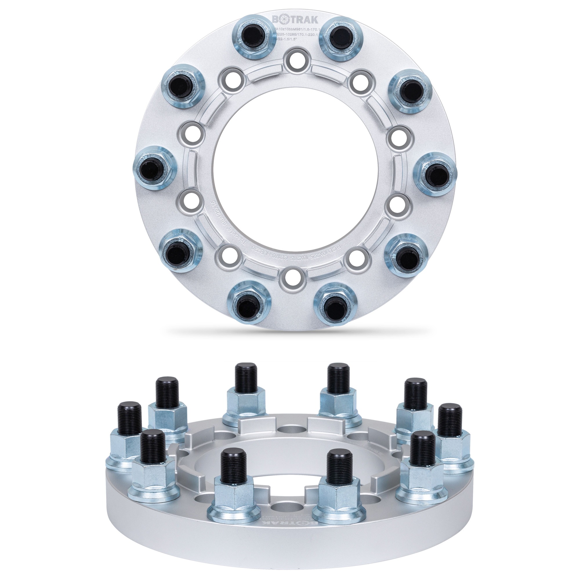 BOTRAK 10x225 to 10x285.75 semi wheel adapters to fit 22.5" or 24.5" (10x285.75) wheel rims (front & single wheel systems). Made of true forged billet alloy aluminum 6061 t6, precisely CNC engineered. Grade 12.9, M22 studs hydraulic pressed. Anodized.